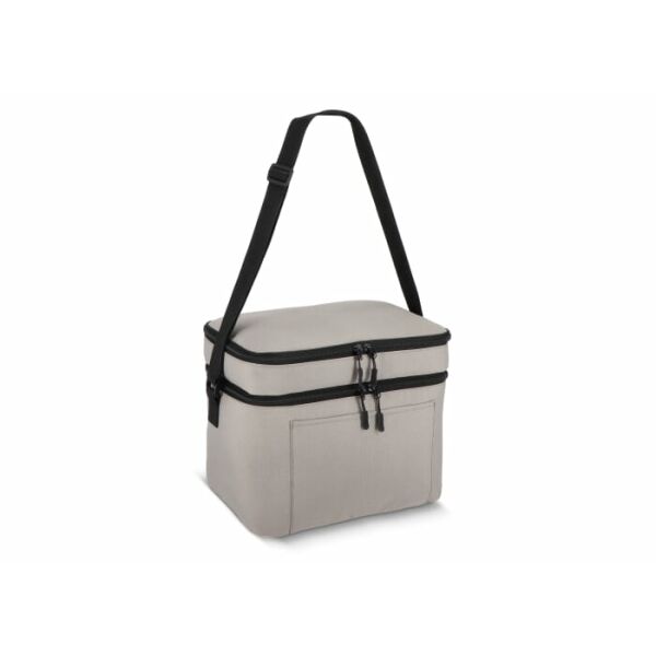 Koeltas van 600D gerecycled PET met een inhoud van 15L, voorzien van een groter ondervak en een kleiner bovenvak. Dankzij de isolerende PEVA-voering kun je warme en koude spullen gescheiden bewaren. De verstelbare schouderriem zorgt voor comfortabel dragen, ideaal voor onderweg.
