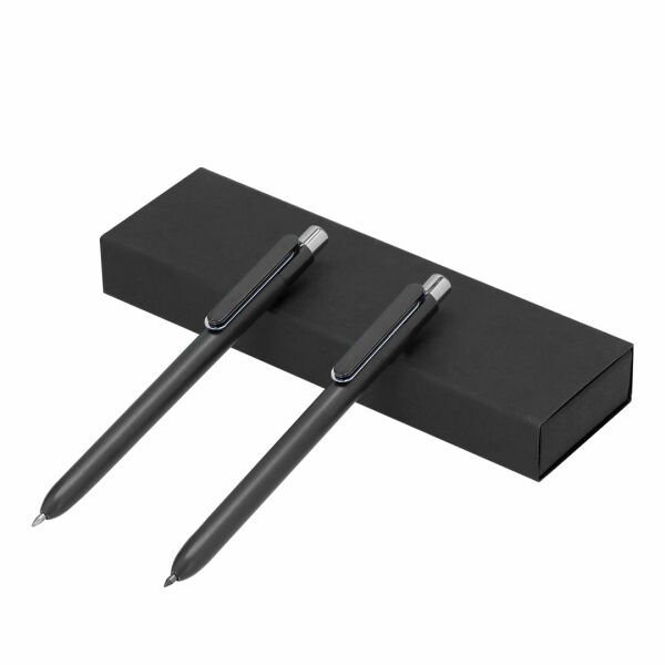Set bestaande uit een blauwe balpen en een eeuwige potlood, beide gemaakt van RABS. Het eeuwige potlood biedt continue schrijfcapaciteit, voorkomt afval, en beide hebben een drukknopmechanisme. Ontworpen met een bijpassende clip en chroomdetails. Gepresenteerd in een zwart gerecycled kartonnen etui. Met een gedrukte RABS-aanduiding.